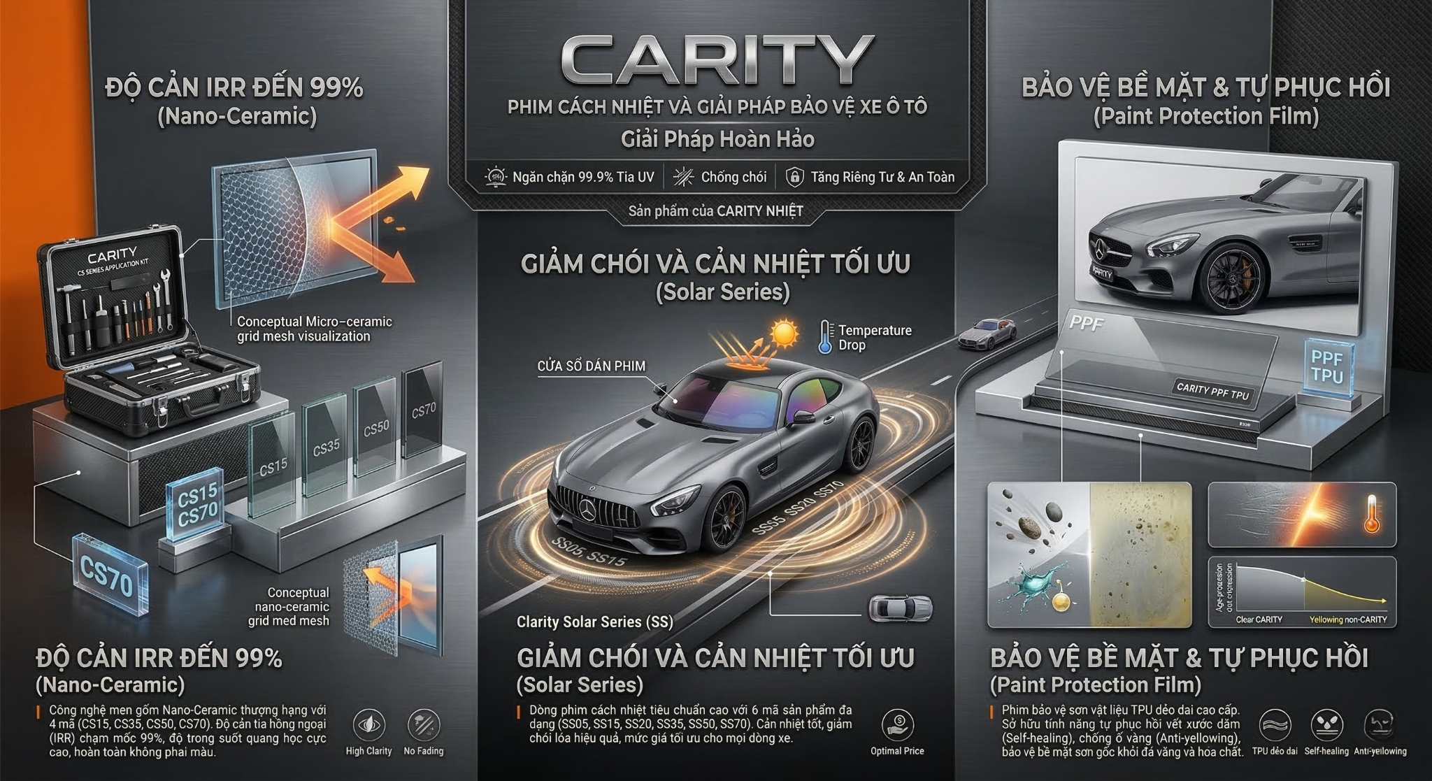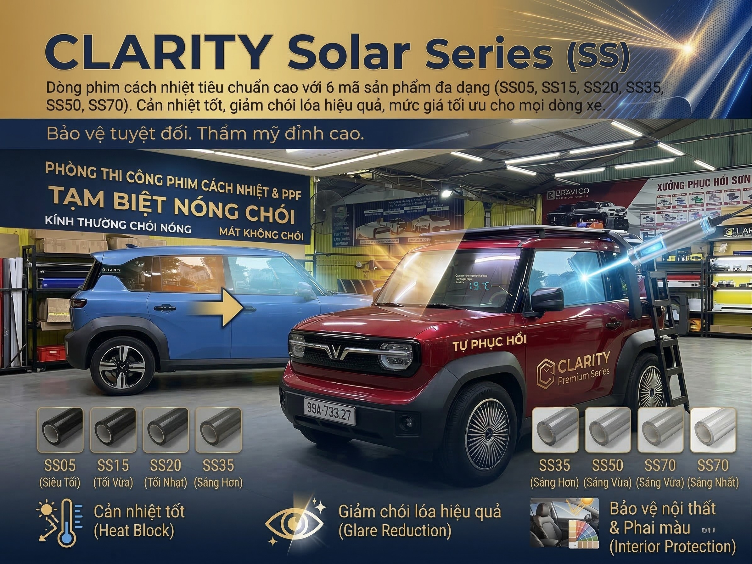 Trải nghiệm đỉnh cao của công nghệ cách nhiệt và bảo vệ toàn diện với CLARITY CAR FILMS & PPF. Chúng tôi tự hào mang đến giải pháp hoàn hảo cho xế cưng của bạn với dòng phim cách nhiệt sử dụng vật liệu Nano-Ceramic cao cấp từ Châu Âu, mang lại sự sang trọng và an toàn tuyệt đối trên mọi hành trình.