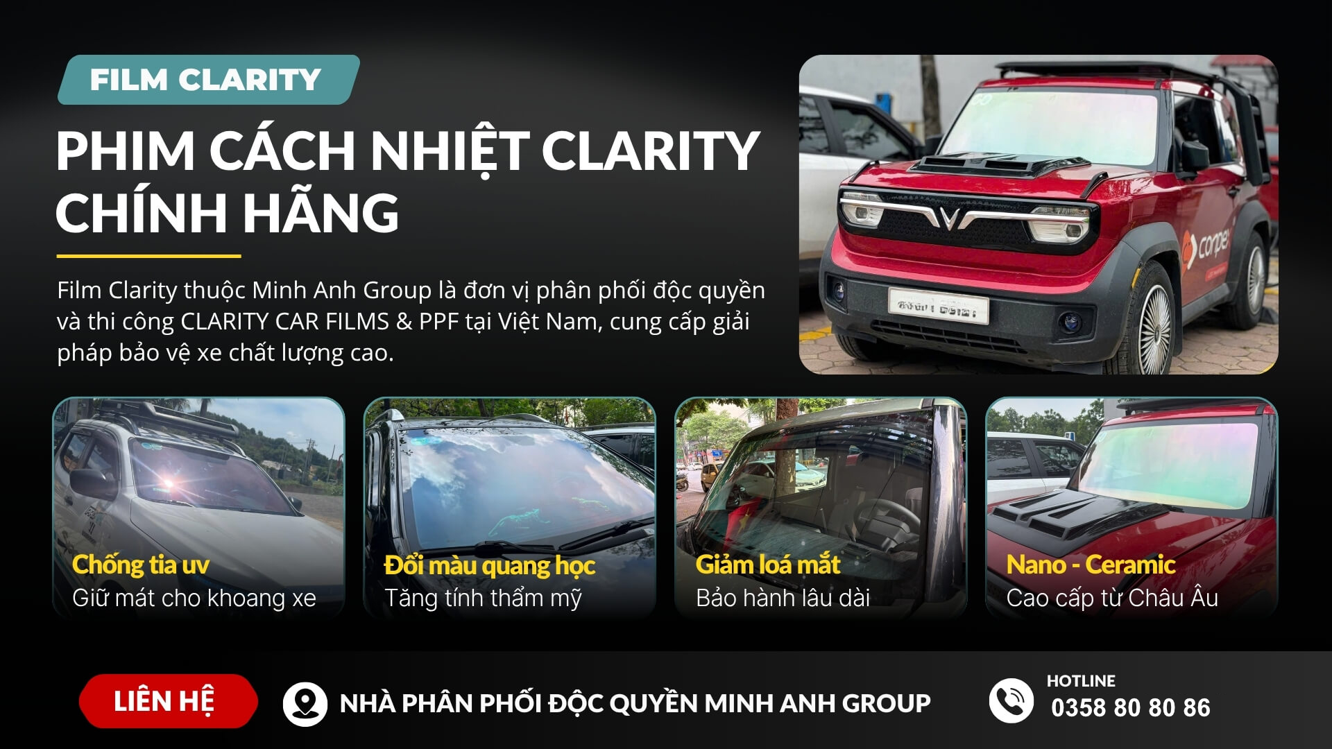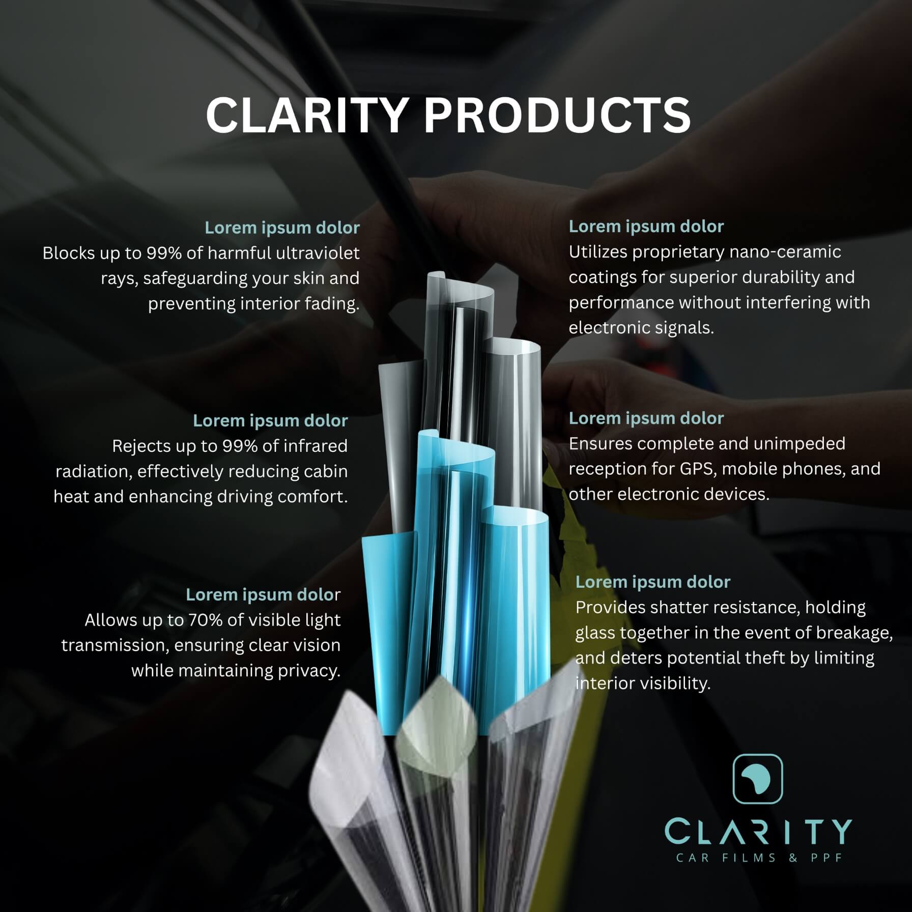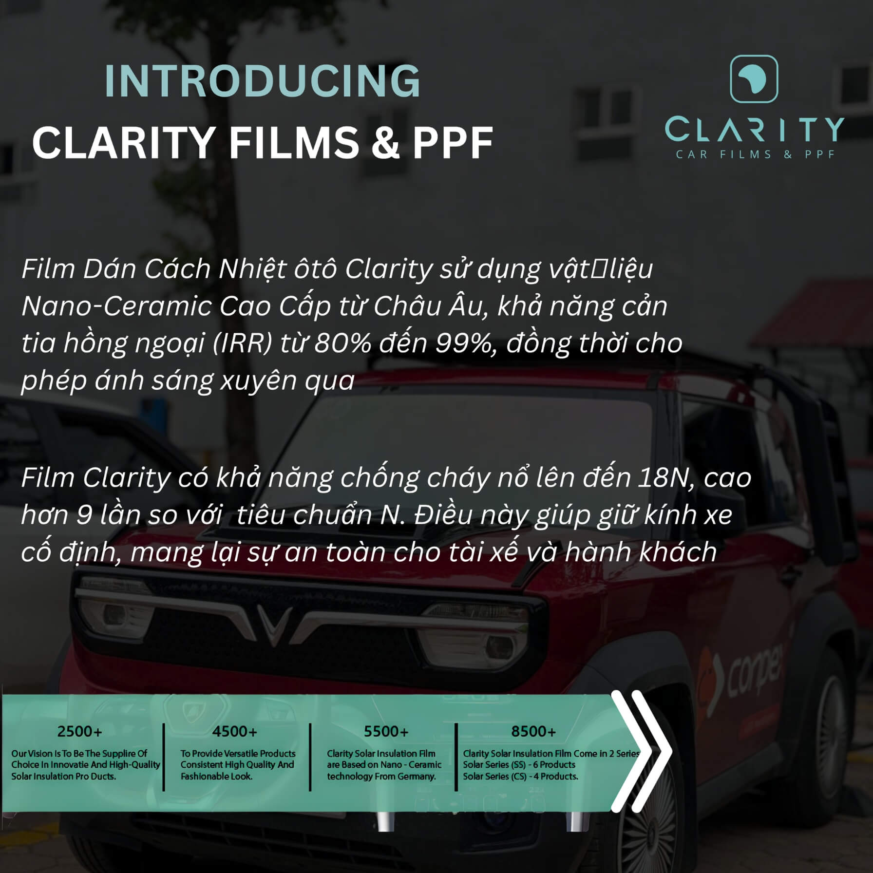 Trải nghiệm đỉnh cao của công nghệ cách nhiệt và bảo vệ toàn diện với CLARITY CAR FILMS & PPF. Chúng tôi tự hào mang đến giải pháp hoàn hảo cho xế cưng của bạn với dòng phim cách nhiệt sử dụng vật liệu Nano-Ceramic cao cấp từ Châu Âu, mang lại sự sang trọng và an toàn tuyệt đối trên mọi hành trình.
