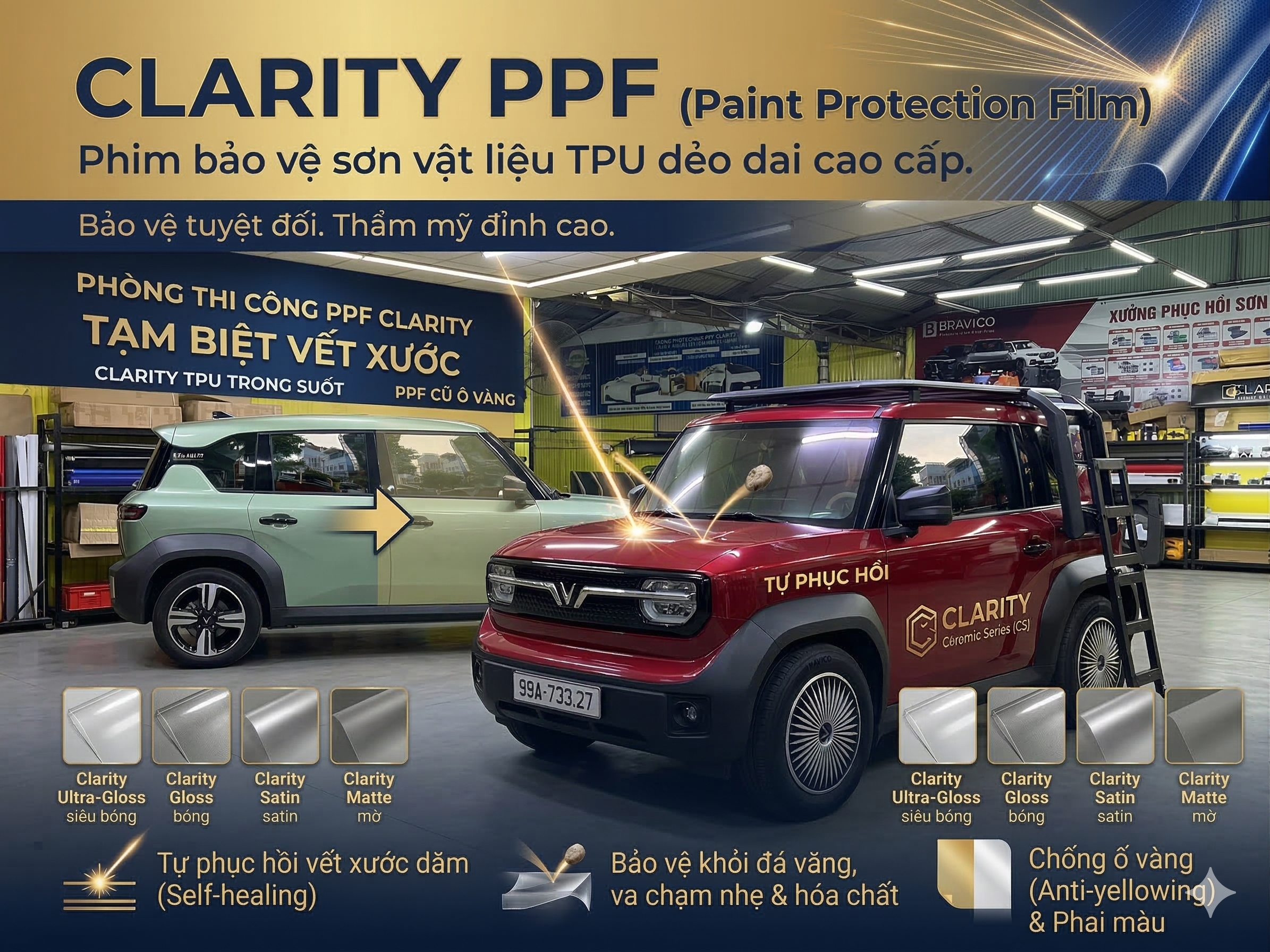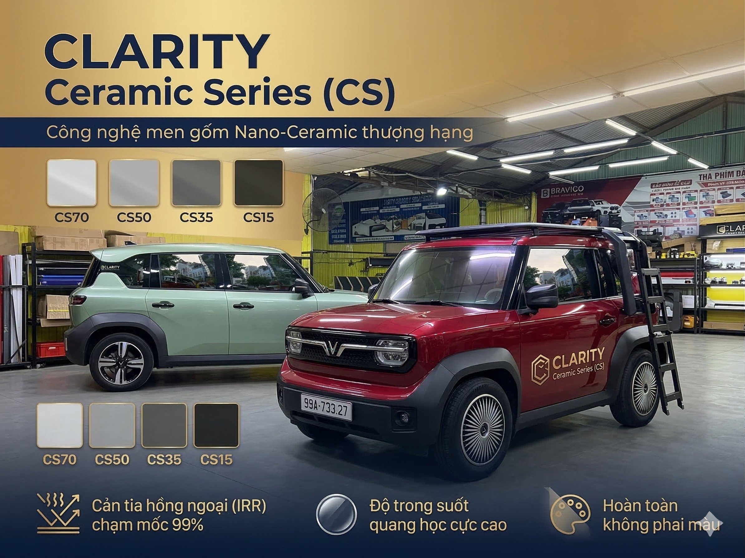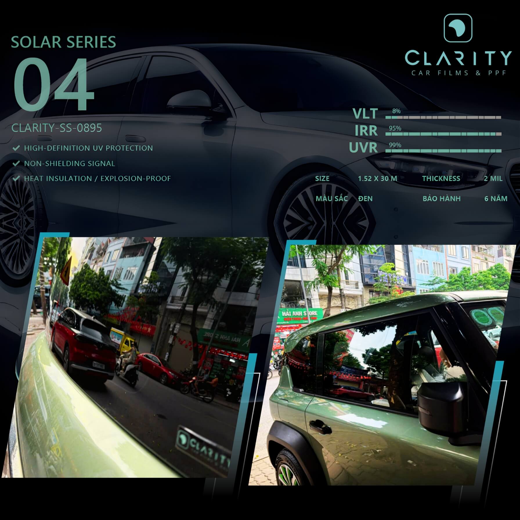 Trải nghiệm đỉnh cao của công nghệ cách nhiệt và bảo vệ toàn diện với CLARITY CAR FILMS & PPF. Chúng tôi tự hào mang đến giải pháp hoàn hảo cho xế cưng của bạn với dòng phim cách nhiệt sử dụng vật liệu Nano-Ceramic cao cấp từ Châu Âu, mang lại sự sang trọng và an toàn tuyệt đối trên mọi hành trình.